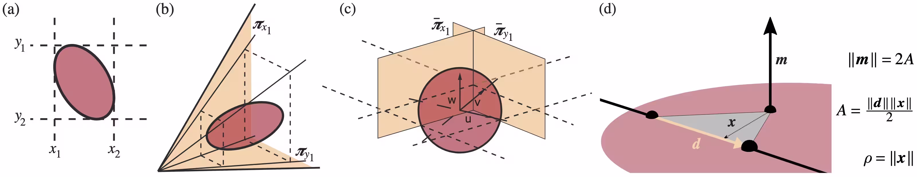 The perspectively correct screen-space bounding box of a splat (a) is given by the projection of its bounding frustum in view space (b). When transformed into local splat coordinates, the frustum planes align with tangential planes of the unit sphere (c). Our approach for splat evaluation along viewing rays makes use of the Plücker coordinate representation ( 𝒅 : 𝒎). In local splat coordinates, the point along the ray that maximizes the Gaussian’s value corresponds to the point 𝒙 that minimizes the perpendicular distance ∥𝒙∥ to the origin (d). Parts (a-c) courtesy of Weyrich et al. [WHA*07]; used with permission.