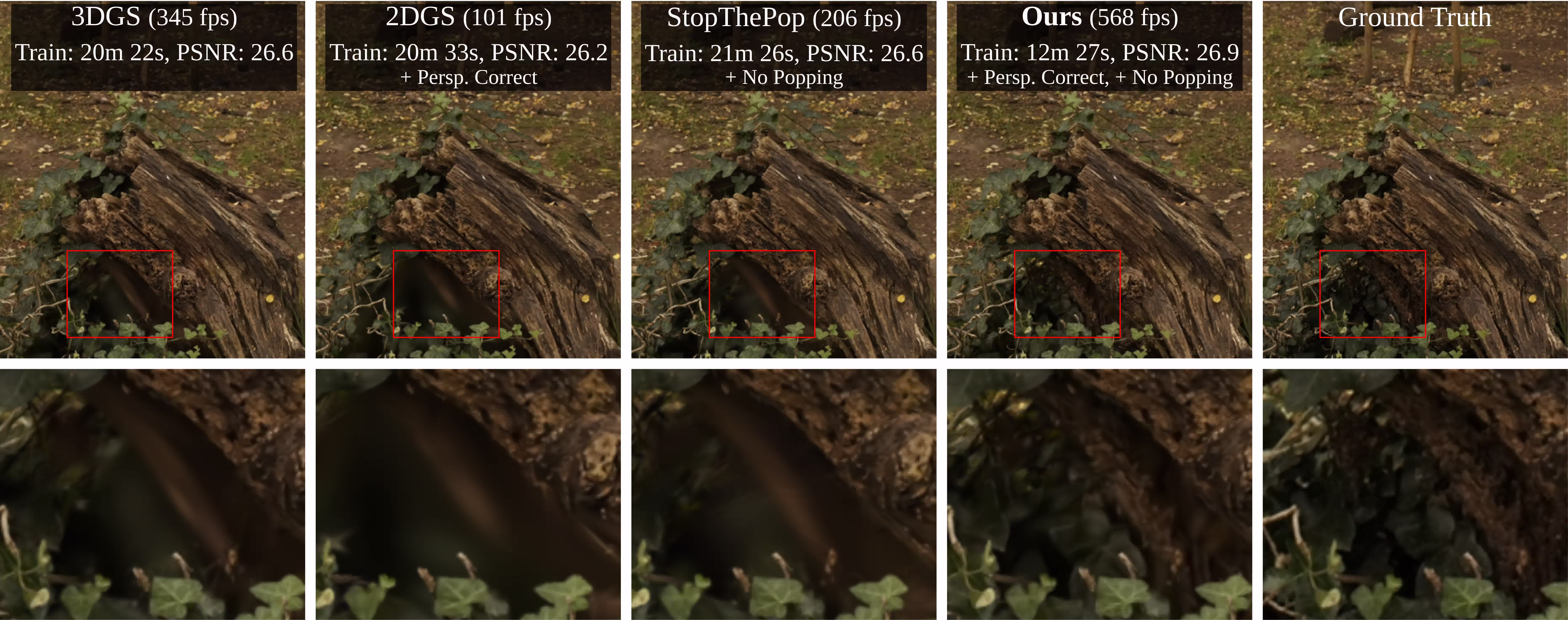 In our work, we aim at achieving maximum coherence, by rendering fully perspective-correct 3D Gaussians while using a high-quality
